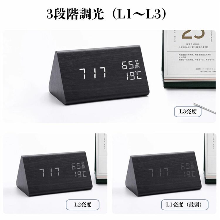 木時計 木製 デジタル目覚まし時計 湿度時計 LED 時計 三角形 電子時計 温度計 夜光 三段輝度 トレンド