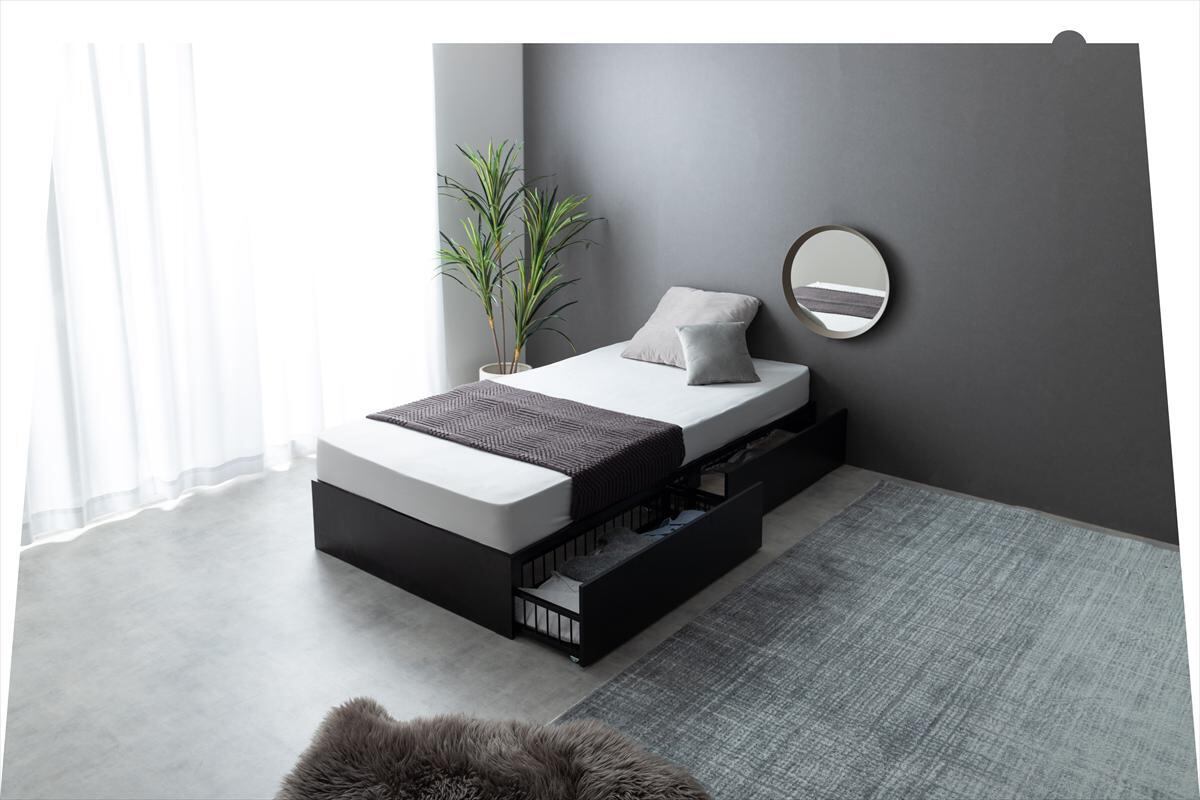 スタイリッシュな美しさとパイプの耐久性を兼ね備えた『Stock(ストック)』引出し収納ベッド