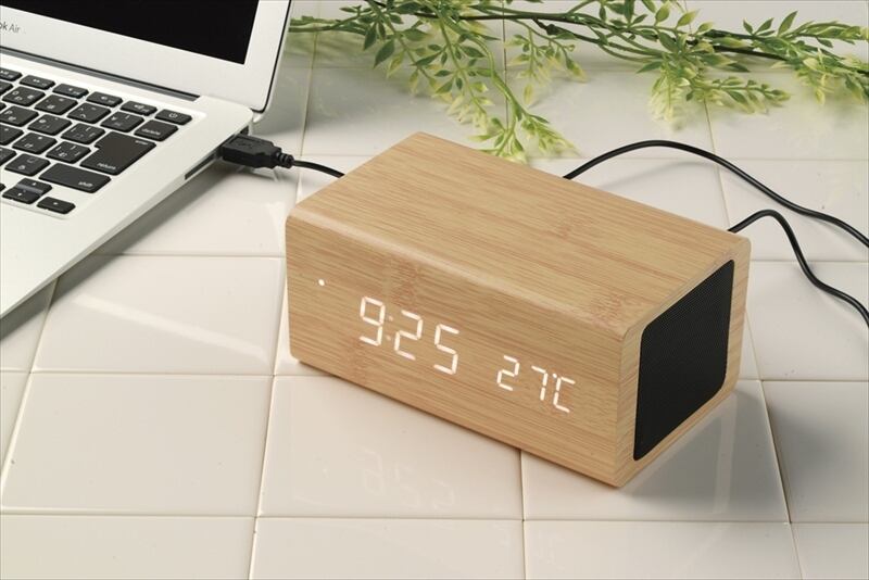 ワイヤレス接続のスピーカーとして。木目調のディスプレイにデジタル時計が浮かび上がり、インテリアとしても素敵。