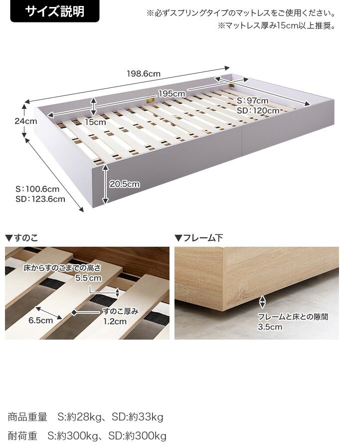 【セミダブル】Slib すのこローベッド(ボンネルマットレス付き)