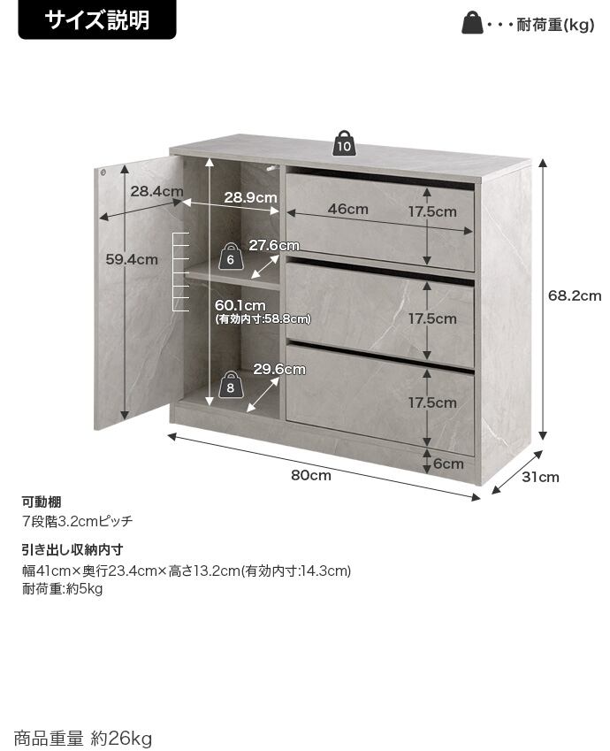【耐荷重】天板:約10kg 、引き出し:約5kg、可動棚:約6kg 、扉収納内底板:約8kg